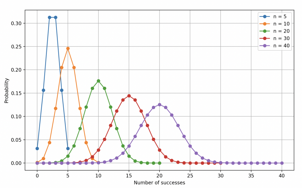 Une remarque importante à prendre en compte est que plus le nombre de lancers est grand plus la loi binomiale se rapproche d’une loi que l’on appelle loi normale (courbe en cloche). Cela peut s’avérer utile dans la modélisation de phénomènes réels, car la loi normale est une distribution couramment observée dans la nature (Nous l’étudierons en détail dans un prochain article).