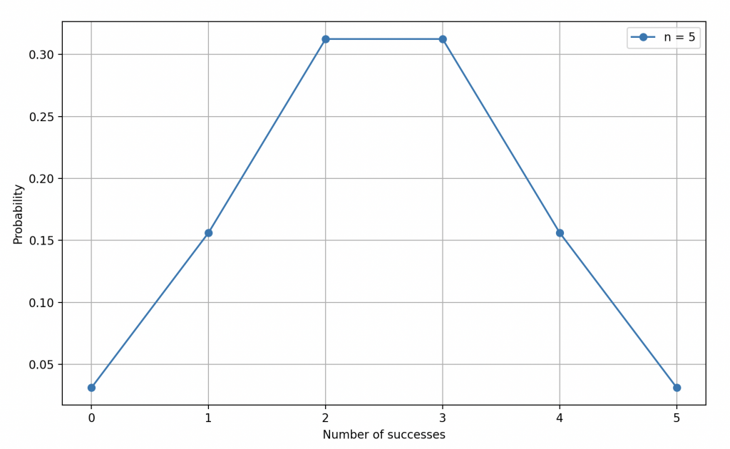 Azar éclaira ensuite les aventuriers sur le mode de la loi binomiale en expliquant que le mode était la valeur de \(n_1\) qui maximisait la probabilité. Pour une pièce équilibrée, il souligna que le mode était situé à \(\frac{n}{2}\), ce qui signifiait que le résultat le plus probable était d’obtenir autant de Pile que de Face.