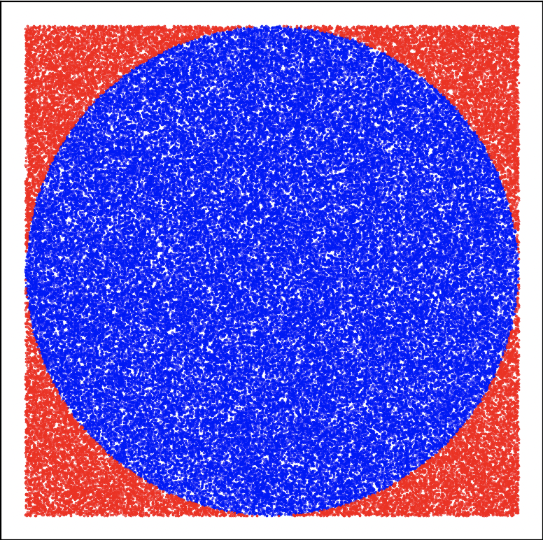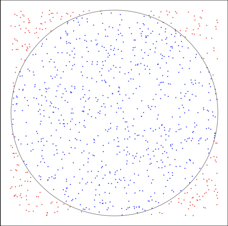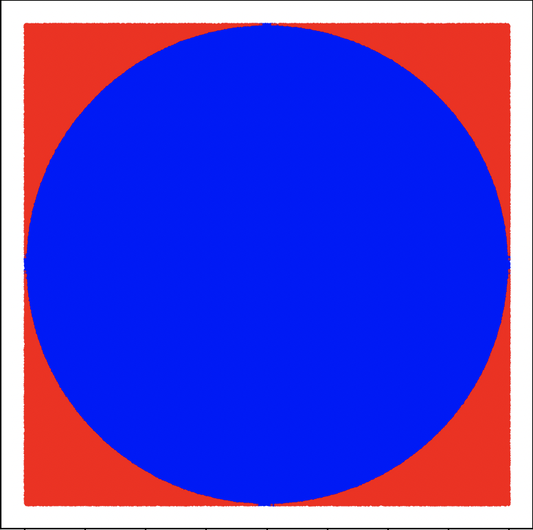 Before continuing, let’s recall that the area of a square of side R is (S_{square}=R²) and the area of a circle of radius R is (S_{circle}=π R²). We will start with the simplest estimation: that of π. This works by using the same steps as outlined previously