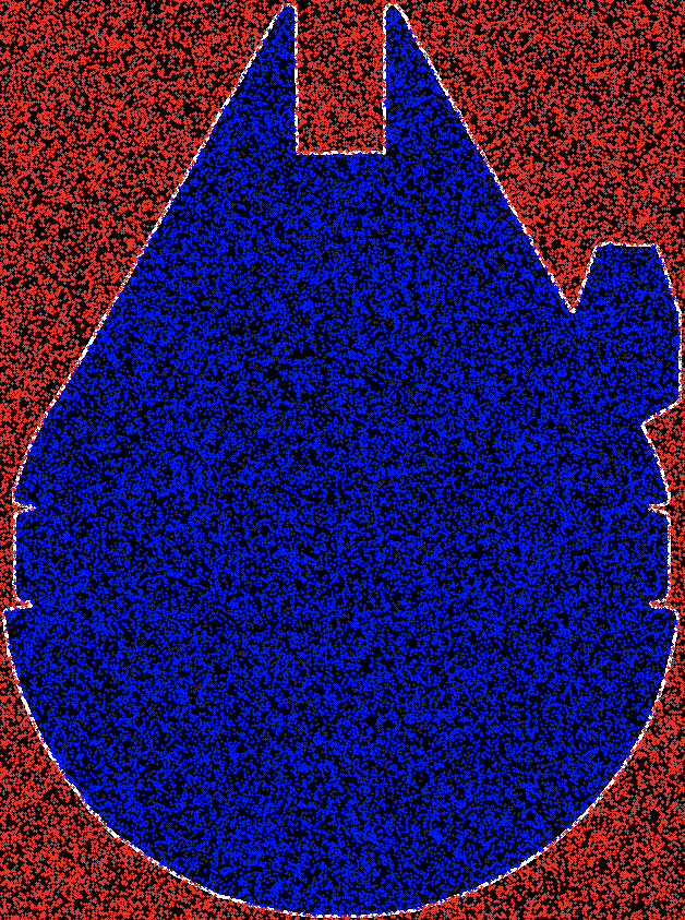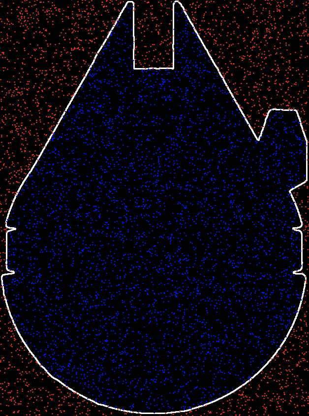 The accuracy of the Monte Carlo method for estimating areas depends on the number of randomly generated shots. The more impacts you generate, the more accurate your estimate will be. However, it is important to note that even if you generate a large number of impacts, you will never be able to calculate the exact value of the area you consider. For example, with 1 million stormtroopers, you can get an estimate of π with an accuracy of about 2 decimal places. For the millenium falcon area, we get approximately 400.855m².